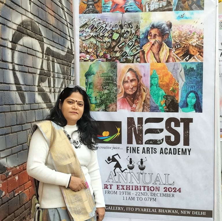 Her artistic style draws deeply from the cultural and spiritual essence of Varanasi, blending traditional influences with expressive contemporary forms. Her paintings are admired for their subtle emotions, fine detailing, and elegant compositions.